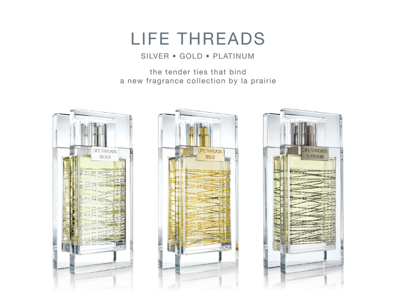 Life Thread Gold von La Prairie vereint die Duftnoten von Pflaumen, Nelkenknospen, Mandarinen, Pfeffer, Zimtrinde, Koriander, Rosen, Maiglöckchen, Ylang Ylang, Weihrauch, Vanille, Patschuli, goldene Myrrhe, Zedernholz, Vanille. Life Thread Silver ist eine Kombination aus Zitrusnoten, Bergamotte, Blattgrün, Tuberose, Jasmin Ylang Ylang, Piment, Orangenblüten, Sandelholz, Vetiver, Moschus und Moos. Und Life Thread Platinum enthält die Essenzen von Veilchenblätter, Pflaumen, Galbanum, Jasmin, Rosen, Ledernoten, Kardamom, Iris, Patchouli, Vetiver, Amber, Eichenmoos und Labdanum.