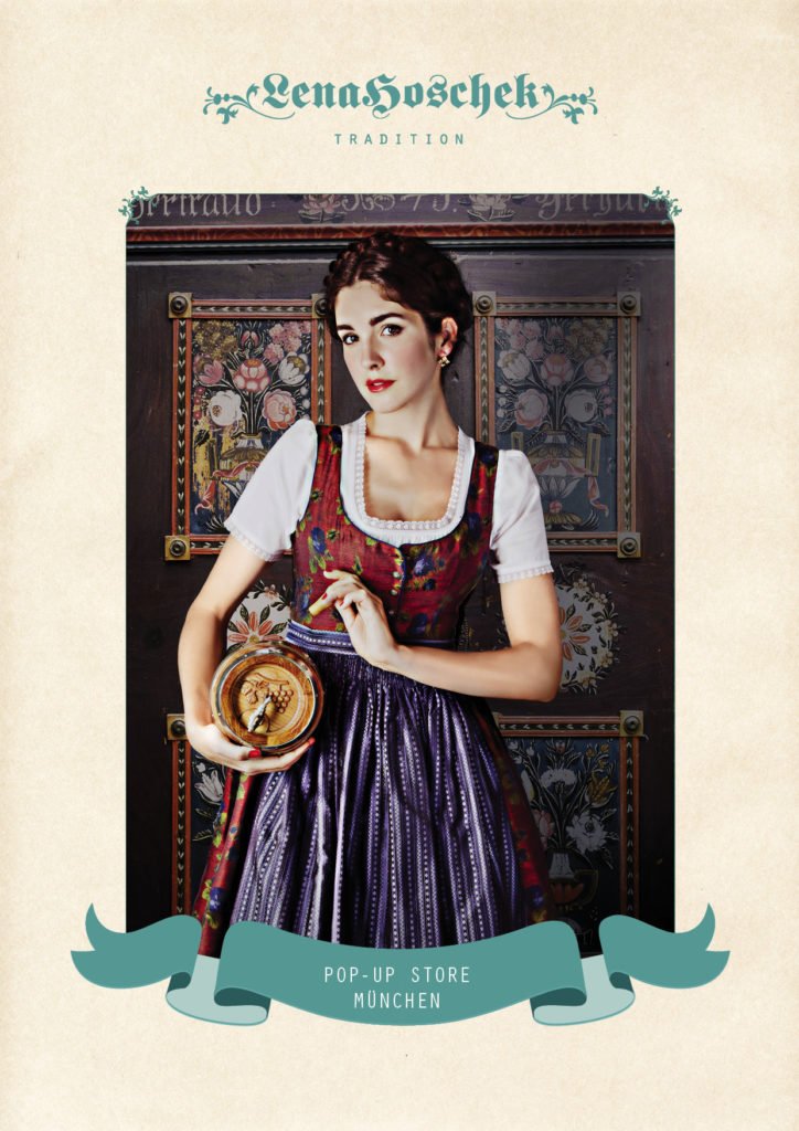 Ein fesches Stück Österreich in München. Kaum ein Kleidungsstück schmeichelt der weiblichen Silhouette mehr als ein Dirndl. Egal ob freches Understatement oder edel aufgehübscht fürs VIP-Zelt auf der Wies’n, tradierte Elemente sind en vogue und das Synonym für hochwertige Qualität. Lena Hoschek, international bekannt durch ihr Vintage Label, reflektiert ihre Passion für überliefertes Handwerk, kostbare Materialien und nostalgische Muster auch in ihrer Dirndl-Linie „Lena Hoschek Tradition“.