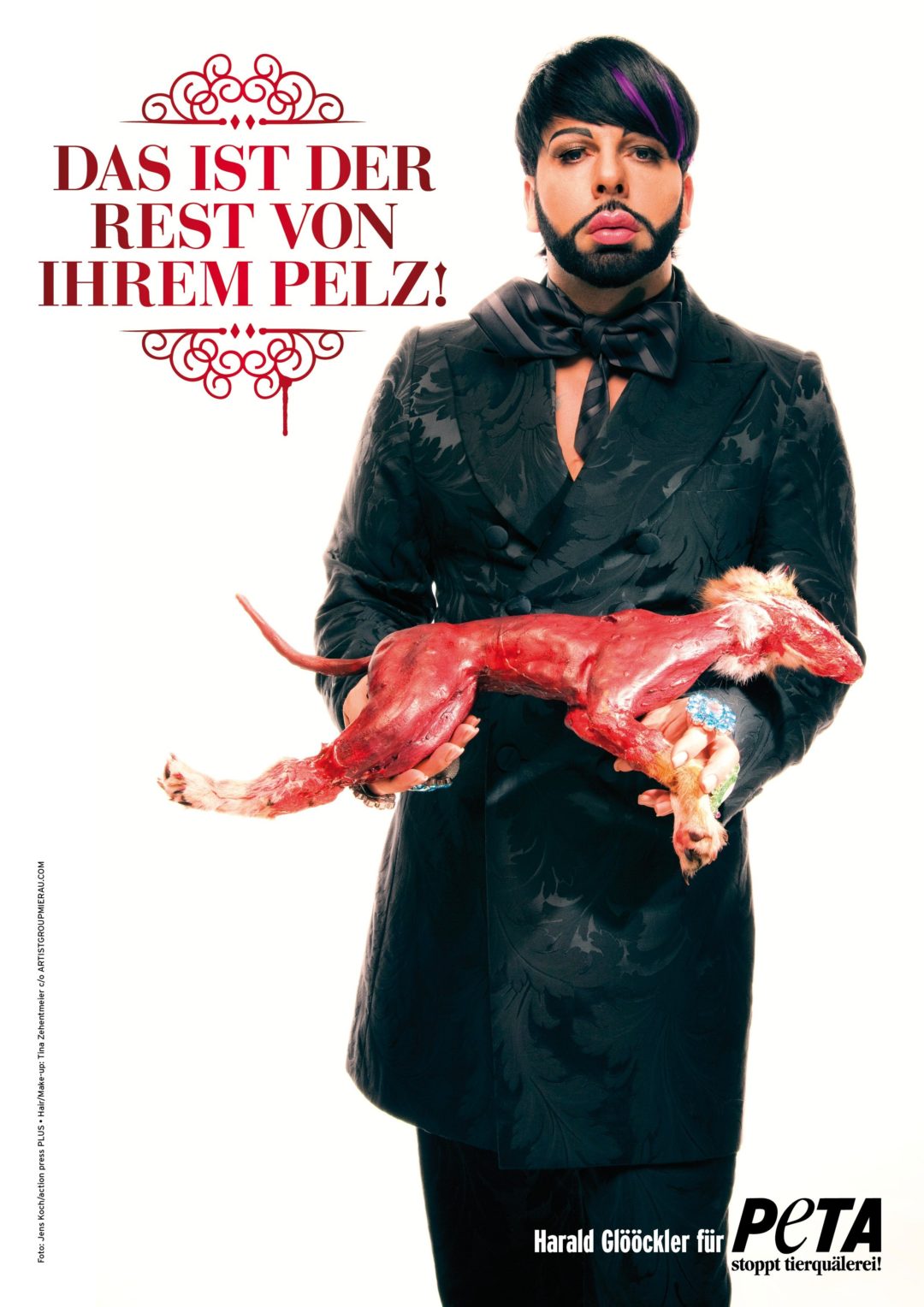 Man mag von Harald Glööckler ja halten, was man will – sein Engagement für Tiere ist aber definitiv top: Er präsentiert nun PETAs neues Anti-Pelz-Motiv. Bereits zum 2. mal spricht er sich gegen den grausigen Modetrend aus: Schon vor einigen Jahren sorgte Harald Glööckler in PETAs Anti-Pelz-Kampagne für Aufsehen, jetzt präsentiert sich der Tierfreund erneut provokant auf einem Protestmotiv gegen das Tragen von Pelzen: