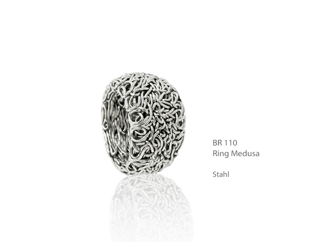 Die Ringe wirken so, als ob durch das Design ein Chaos geordnet wird. Der Schmuck besteht aus feinen Edelstahldrähten, die sich winden und ineinander verschlingen und so ein komprimiertes ganzes Stück ergeben. Der Stahl wird außerdem mit schwarzer PVD-Bedampfung versehen, die optisch eine rockige Note unterstreicht. Man bekommt die Ringe solo und wahlweise mit einer eingearbeiteten Tahiti- oder Süßwasserperle oder 3 oder 5 eingearbeiteten Diamanten. So finden sich auch hier die Themenschwerpunkte von Schmuckwerk wieder.