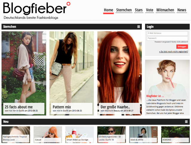Unter Blogfieber.com findet man neuerdings eine Plattform, die sich im eigenen Selbstverständnis als Übersicht über „Deutschlands besten Fashionblog“ präsentiert. Also ein Portal, für Blogger und Leser gleichermaßen gemacht, auf dem jeder Modebegeisterte seine Outfits und Kreationen, inklusive der dazugehörigen Blogartikel, posten kann.