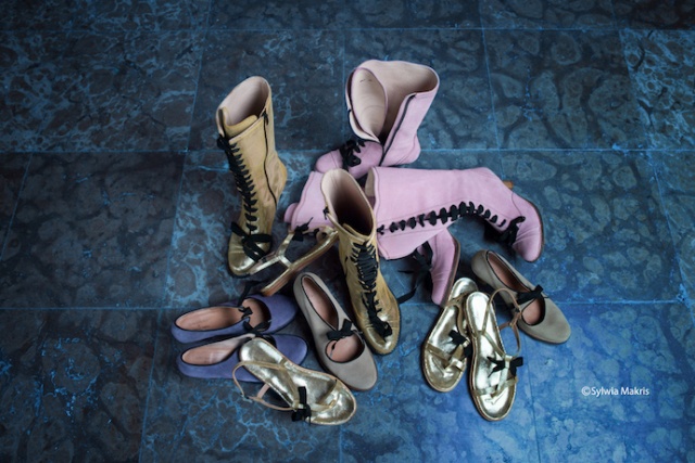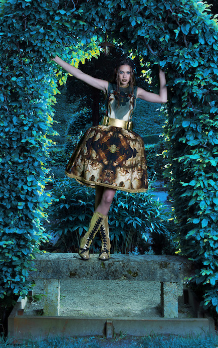 In perfekter Synergie zu ihren Styles wählte Rebbeka Ruétz die Modelle der spanischen Schuhmarke Neosens für die Präsentation auf dem Laufsteg. Besonders die geschnürten Stiefel aus glattem, glänzenden Leder in funkelnden Gold unterstützen die extravaganten Entwürfe.