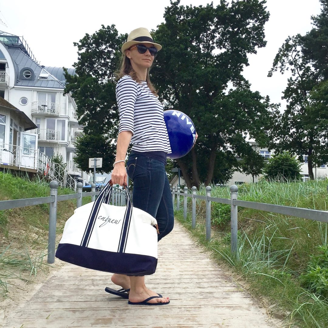 An der Küste zelebriere ich einen klassischen Seaside Style. Er ist ein Stück weit das Geheimnis meiner grenzenlosen Entspanntheit an der See. Über viele Reisen hinweg habe ich eine bis in kleinste Detail abgestimmte Osteegraderobe zusammengestellt. Von Outfit, Accessoires bis zum Reisegepäck folgt alles einem konsequent maritimen Look. Es ist perfekt. Ich kann in 1,5 Stunden für vier Personen, zwei Wochen und jede Wetterlage packen. Alles passt immer zusammen, die Vorbereitungen laufen stressfrei und jeder ist happy (sogar Männer).