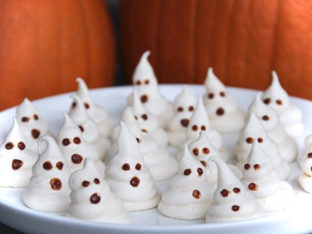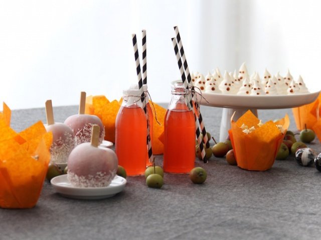 Auf meinem Sweet Table durften kleine Köstlichkeiten wie Kekse, Popcorn und mit Zuckerguss überzogene Äpfel natürlich nicht fehlen. Die niedlichen Baiser Geister sind kinderleicht nachzumachen und lassen sich toll mit Zuckerschrift verzieren. Griffbereit für viele Hände fülle ich alles was klein oder klebrig ist in Muffinförmchen. Diese hier stahlen in einem wunderschönen Kürbisorange und zaubern auch als Teelichthalter stimmungsvolles Licht.