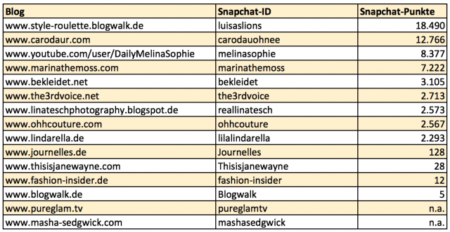Ich habe daher hier eine Übersicht über die größten Modeblogger Stars im Snapchat Ranking erstellt, basierend auf der Anzahl der Snapchat-Punkte.