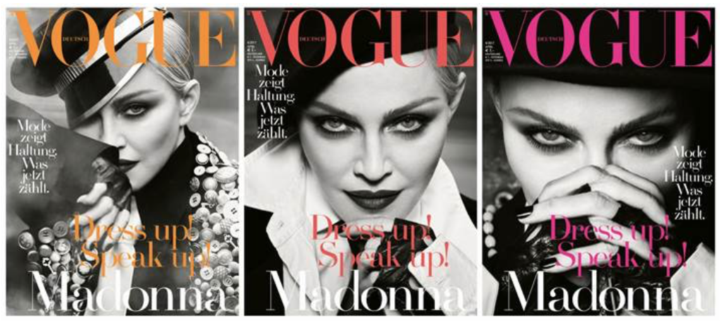 Alle Versionen der drei Cover-Motive mit Madonna sind ab dem 8.3. mit April-Ausgabe der VOGUE Deutschland am Kiosk erhältlich.