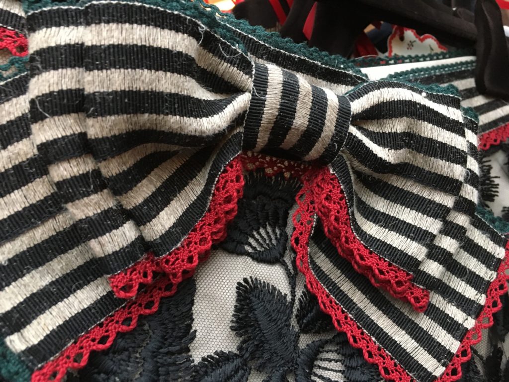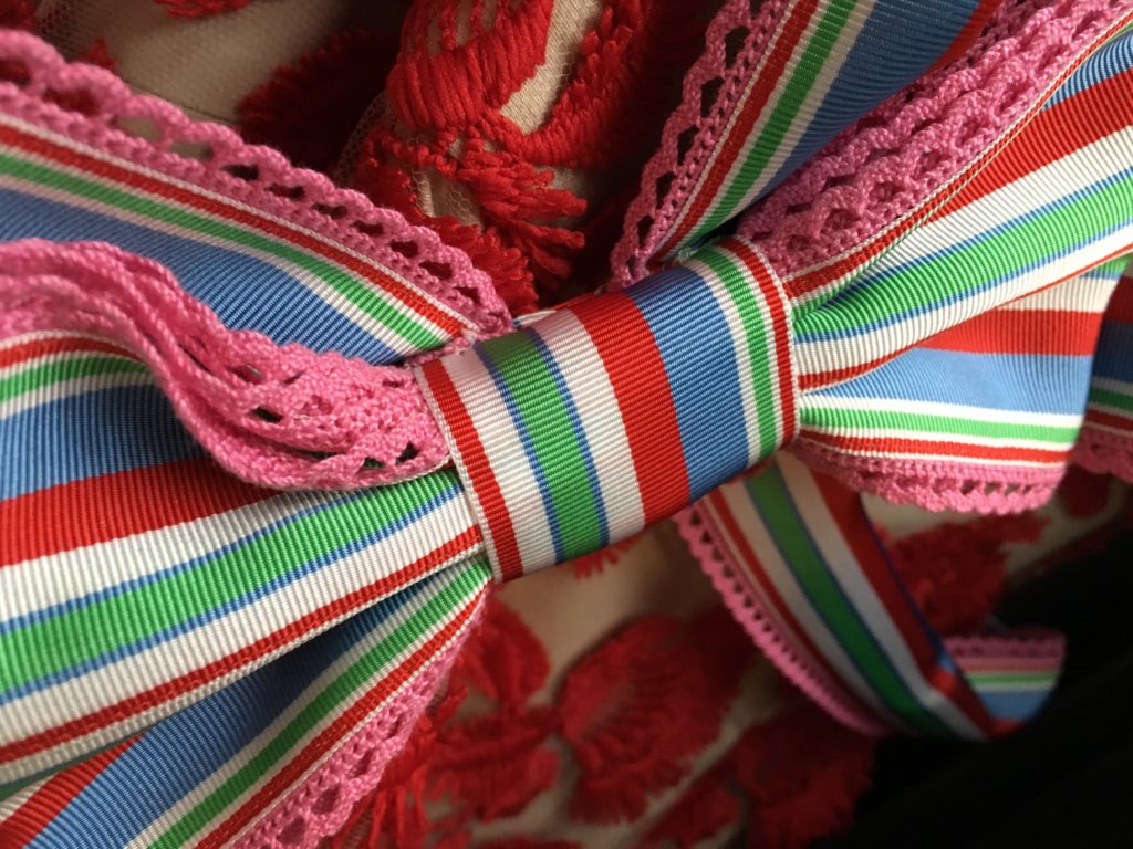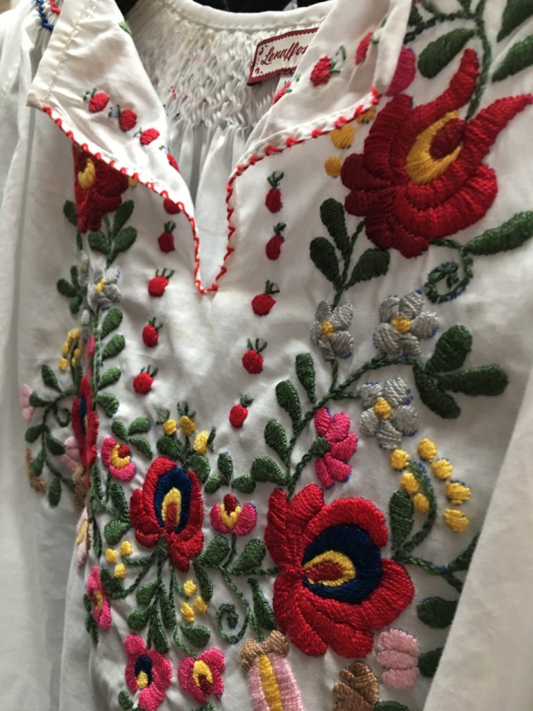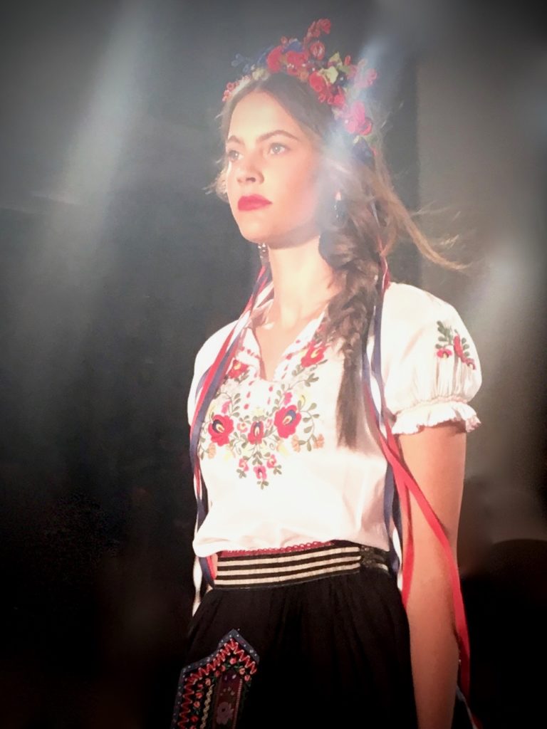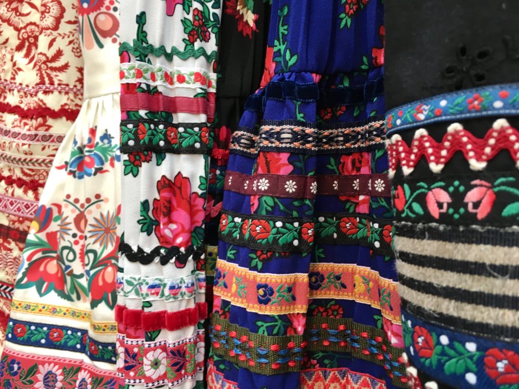 „Kiss me Piroschka“ nennt Hoschek diese textile Reise und bedient sich dabei verschwenderisch der farbenfrohen Matyó-Stickerei, die charakteristisch für die Volkstrachten im Nordosten Ungarns ist.