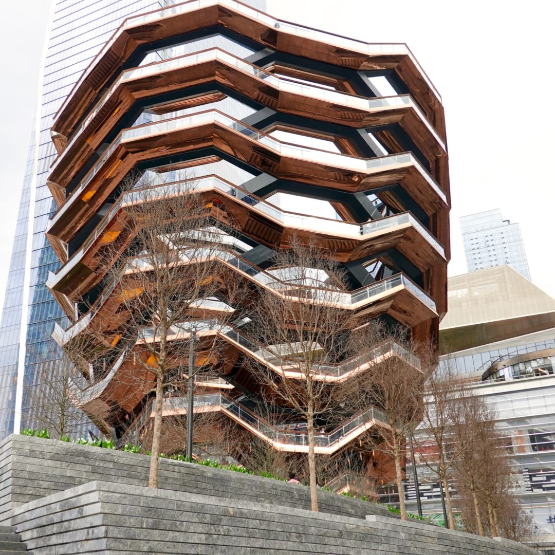 Treppen, Treppen und noch mehr Treppen. Im Zentrum der schwindelerregender Hochhäuser formiert sich „The Vessel“ als interaktive Aussichtsplattform in glänzend kupferfarbener Hülle. Auf 15 Stockwerken verteilen sich 80 Podeste die spektakuläre Ausblicke auf die Stadt garantieren. Damit bietet der wabenartige Bau die besten Voraussetzungen um zum neuen Social-Media-Hotspot zu avancieren. Auch wenn die New Yorker dieses Treppenhaus als Fitnessstudio für die Selfigeneration verlachen und die New York Times das Bauwerk als „stairway to nowhere“ bezeichnete, seit seiner Eröffnung muss der kostenlose Aufstieg über Zugangstickets reguliert werden um dem Besucherandrang Stand zu halten.