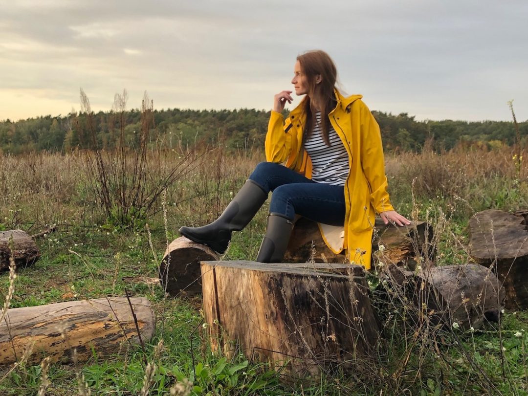 * Dieser coole gelbe Regenparka sowie die Gummistiefel im klassisch zeitlosen Reitstiefellook wurden als PR Sample zur Verfügung gestellt.