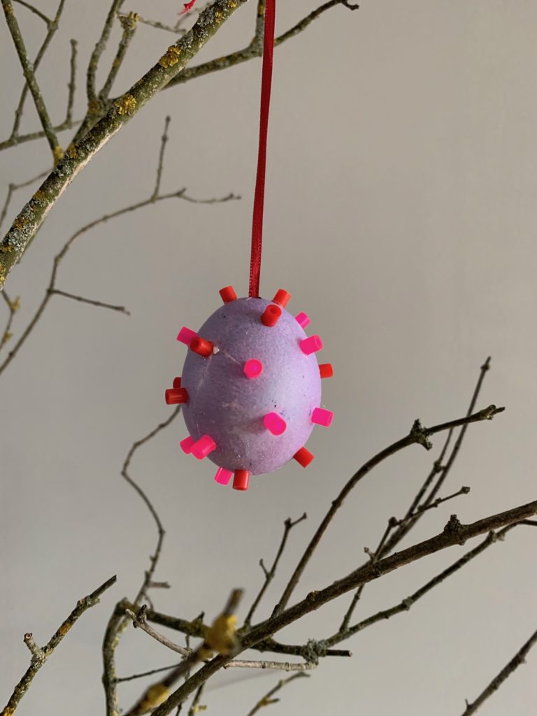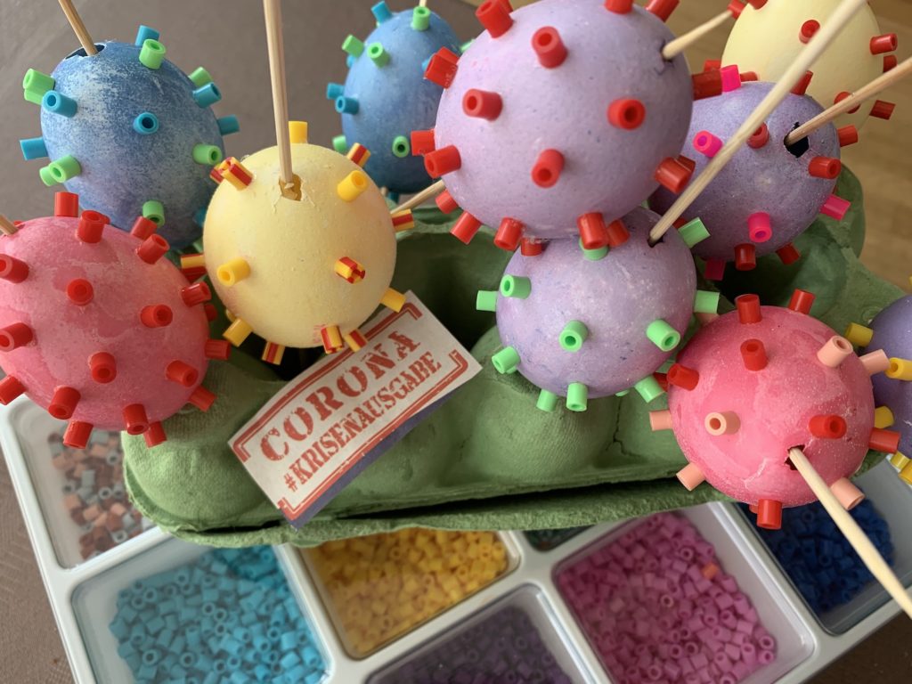 Für die Corona Krisenausgabe von Ostereiern braucht es nicht viel. Eierfarben, Klebstoff und ein paar Bügelperlen verwandeln im Handumdrehen jedes schnöde Ei in einen kleinen Coronavirus.