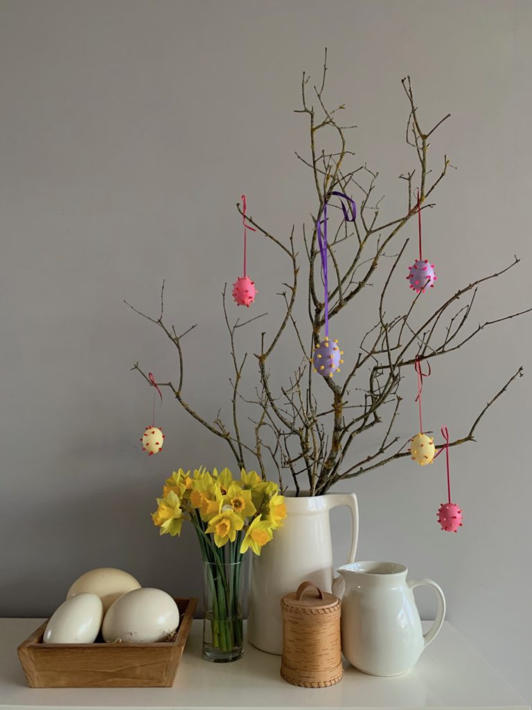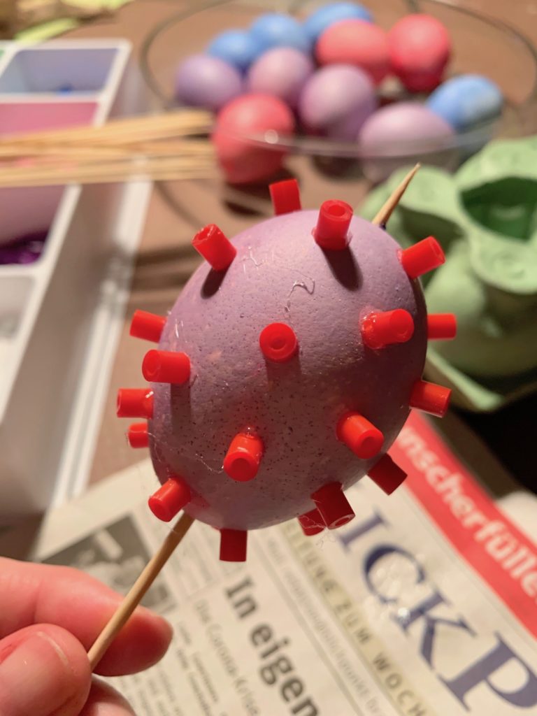 Nach 10 Minuten Trocknung können die Osterviren aufgefädelt und aufgehängt werden. Aber nicht vergessen – schön auf Abstand achten.