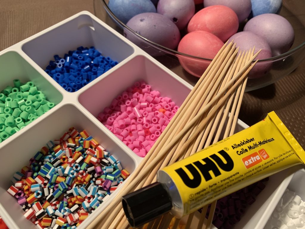 Sind die Farben getrocknet, piekst man die Eier, zur leichteren Handhabung, auf ein Holzstäbchen und bestückt sie mit den kleinen Bügelperlen. Dazu etwas flüssigen Kleber auf ein Blatt Papier geben und die Perlen kurz darin eintunken. Die Leichtgewichte haften sofort und müssen nicht groß angedrückt werden. Mit Abstand werden die Perlen über das ganze Ei verteilt, bis die ganze Oberfläche bedeckt ist.