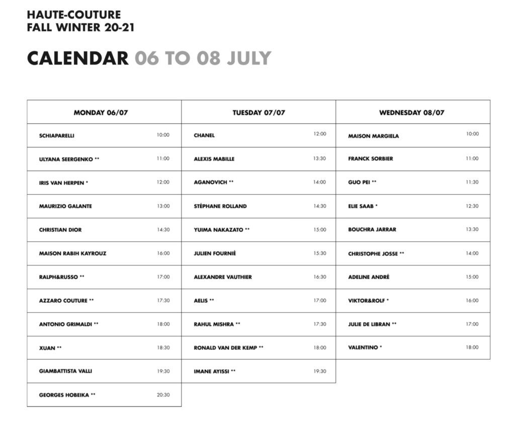 Was für die Einen eine große Enttäuschung darstellte, war für den Großteil der Fashion Fans eine echte Offenbarung. Diesmal konnte die ganze Welt per Stream live dabei sein. Zwischen einer und 15 Minuten Zeit hatten die Labels sich und ihre Mode zu präsentieren. Die Videos liefen vom 06.-08. Juli 2020 via hautecouture.fhcm.paris.