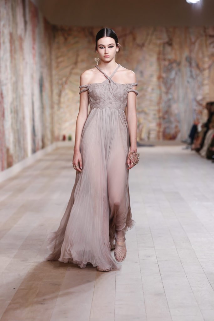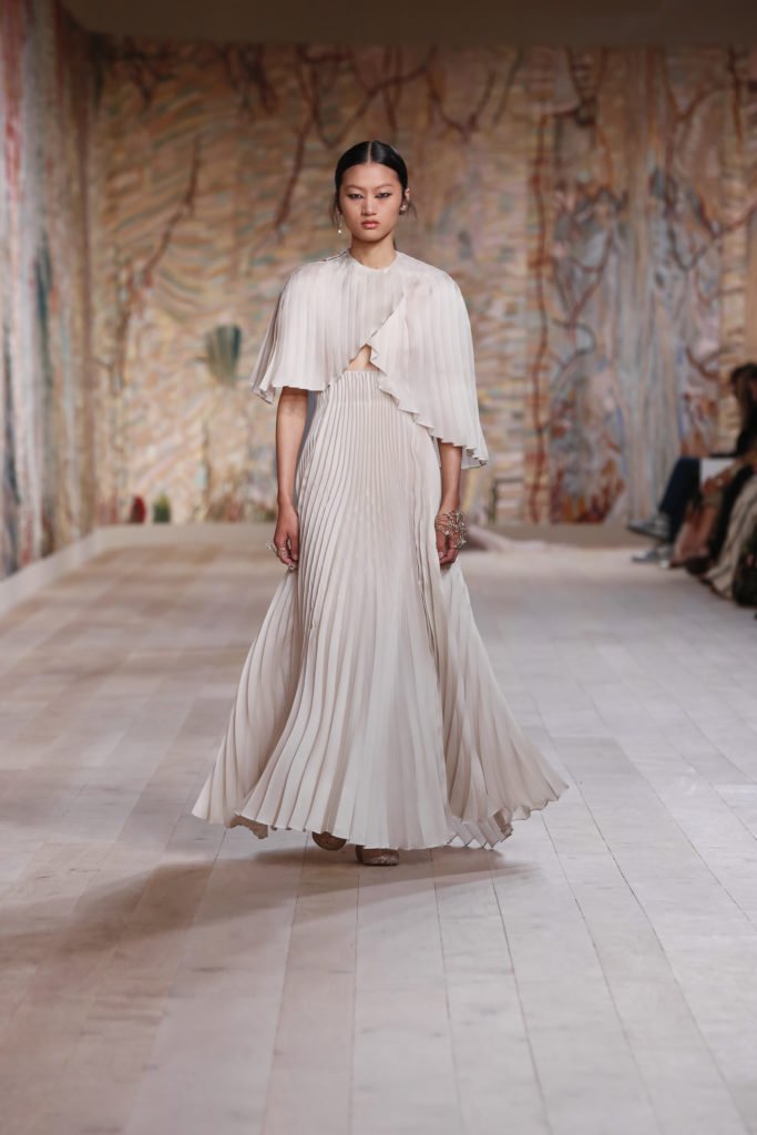 Hochgeschlossen liegt der Fokus in der nächsten Saision wieder auf der Taille, die häufig mit leichten Gürteln oder viel Faltenwurf betont wird. Figurumspielend aber keineswegs eng feiert Maria Grazia die weibliche Silhouette. Besonderen Wert legt die Couturière auf kontrastreichen Materialmix. Es wird drapiert, gefaltet, geschnürt, verflochten, gewebt und plissiert – trotzdem wirken die Entwürfe schlicht und zurückgenommen.