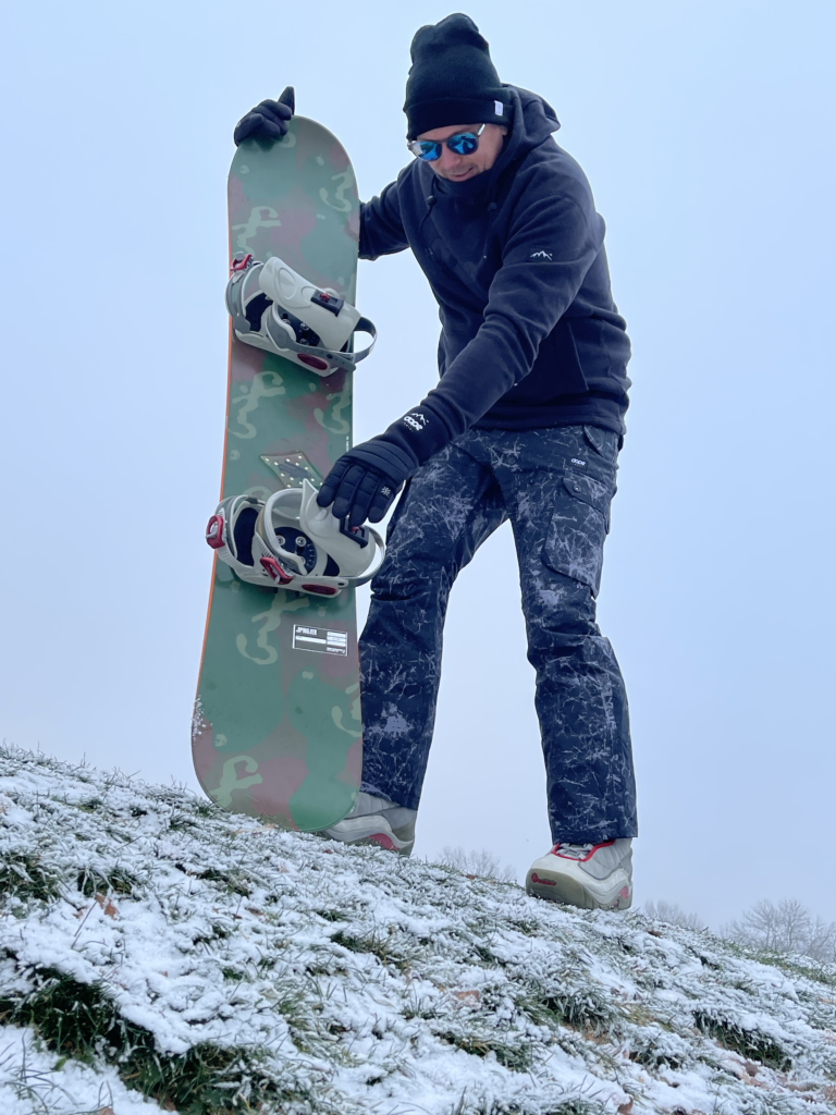 Als Erstes haben wir uns die Snowboardjacke Adept von Dope Snow mal genauer angesehen. Die Snowboardjacke hat ein schlichtes Design, wirkt aber trotzdem cool und sportlich. Die Materialien sind atmungsaktiv und wasserdicht, sodass auch bei feuchterem Schnee alles trocken bleibt. Durch den langen Schnitt mit dem langen Reißverschluss ist nicht nur der Oberkörper, sondern auch der Gesässbereich warm verpackt. Das Besondere an der Adept Snowboardjacke ist, dass Ihr die Jacke für unterschiedliche Zwecke nutzen könnt und viele praktische Features bekommt. Die Jacke ist vielseitig einsetzbar und verfügt über die wichtigsten Funktionen beim Snowboardfahren. So gibt es natürlich Schneefänge, damit kein Schnee in die Jacke rutschen kann, aber auch eine praktische Smartphonetasche mit Kabelführung für die Kopfhöhrer. Dope Snow legt bei den Materialien für die Jacke viel Wert auf Nachhaltigkeit. Durch den modernen Designansatz könnt Ihr die Jacke am Berg und beim Apres-Ski tragen. Die Jacke ist gefüttert, hat ein geringes Eigengewicht und wirkt insgesamt aber weniger voluminös. Wenn es mal zu warm wird beim Skifahren, kann man die super praktischen Lüftungsöffnungen unter den Achseln verwenden, um die Jacke noch atmungsaktiver zu machen. - Dope Snow Iconic Snowboardhose Herren Rock Black