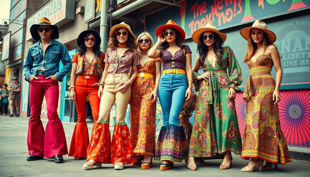 - Schlüsselelemente wie Schlaghosen, Plateauschuhe und Batikprints prägen den 70er-Stil