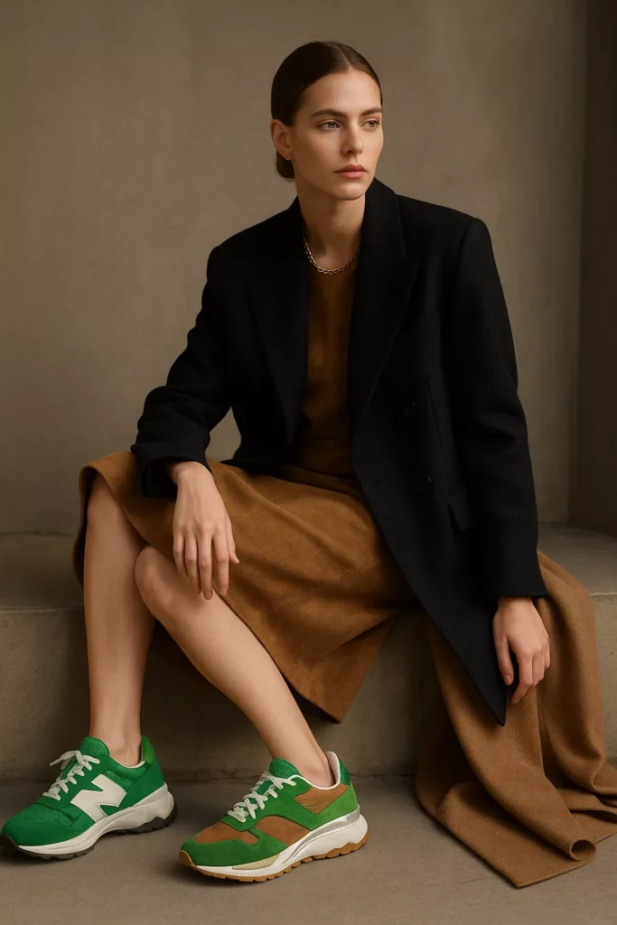 Eine der spannendsten Kooperationen des Jahres bringt feminine Eleganz und sportliche DNA zusammen. Miu Miu interpretiert einen New Balance-Klassiker mit luxuriösem Wildleder, schimmernden Mesh-Elementen und harmonischen Herbsttönen. Das Ergebnis: ein Sneaker, der sowohl auf der Straße als auch auf dem Laufsteg funktioniert.